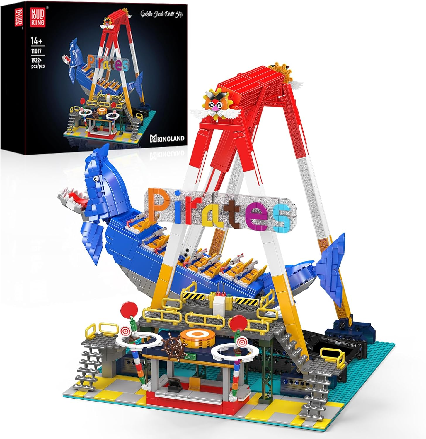 Mould King 11017 Piratenschiff im Vergnügungspark Baustein, Elektrisches Schaukelpiratenschiff mit Motor, MOC Vergnügungsparkgebäude Modell Bauset