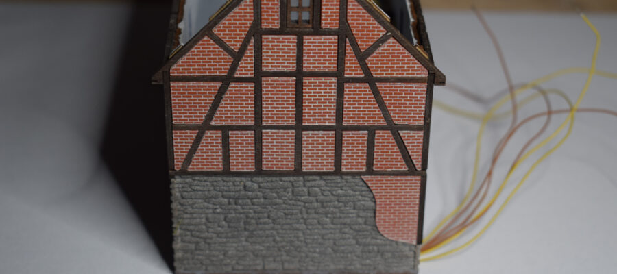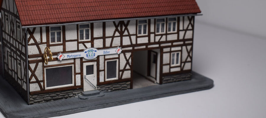 Eine Metzgerei mit Hinterhof gibt es von Busch in H0. (Busch 1530 und Hinterhof 1531) Mit echten Holzfachwerk und Holzbalkon