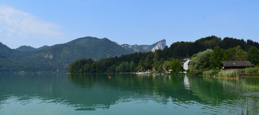 Der Mondsee im oberösterreichischen Salzkammergut ist einer der wärmsten Badeseen der Region und bekannt für seine markante Kulisse durch die Drachenwand.