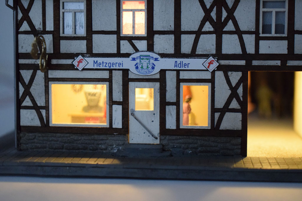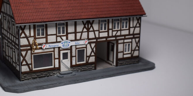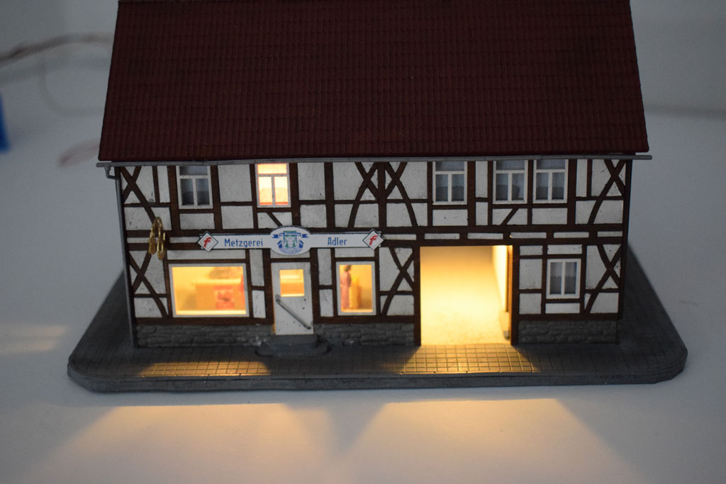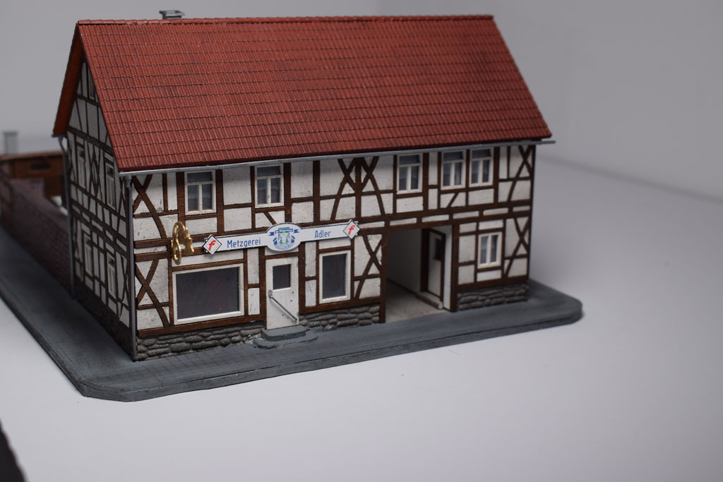 Eine Metzgerei mit Hinterhof gibt es von Busch in H0. (Busch 1530 und Hinterhof 1531) Mit echten Holzfachwerk und Holzbalkon auf der Rückseite, sowie eine realistische Nachbildung der Gefache mit Putzstruktur und Durchfahrt zum Hinterhof.