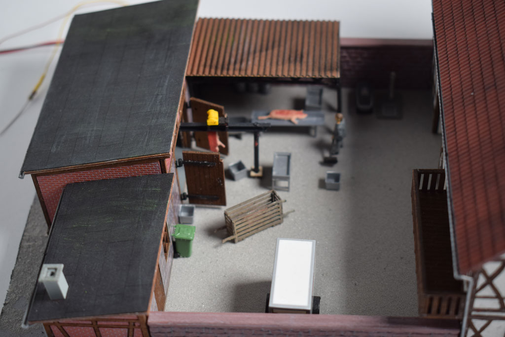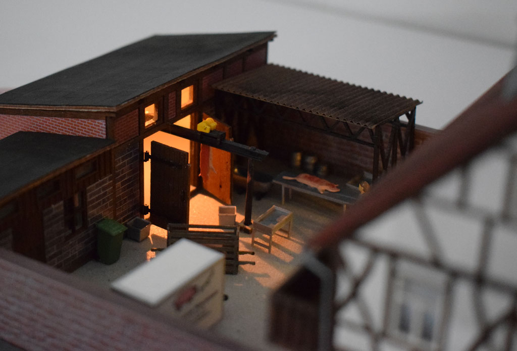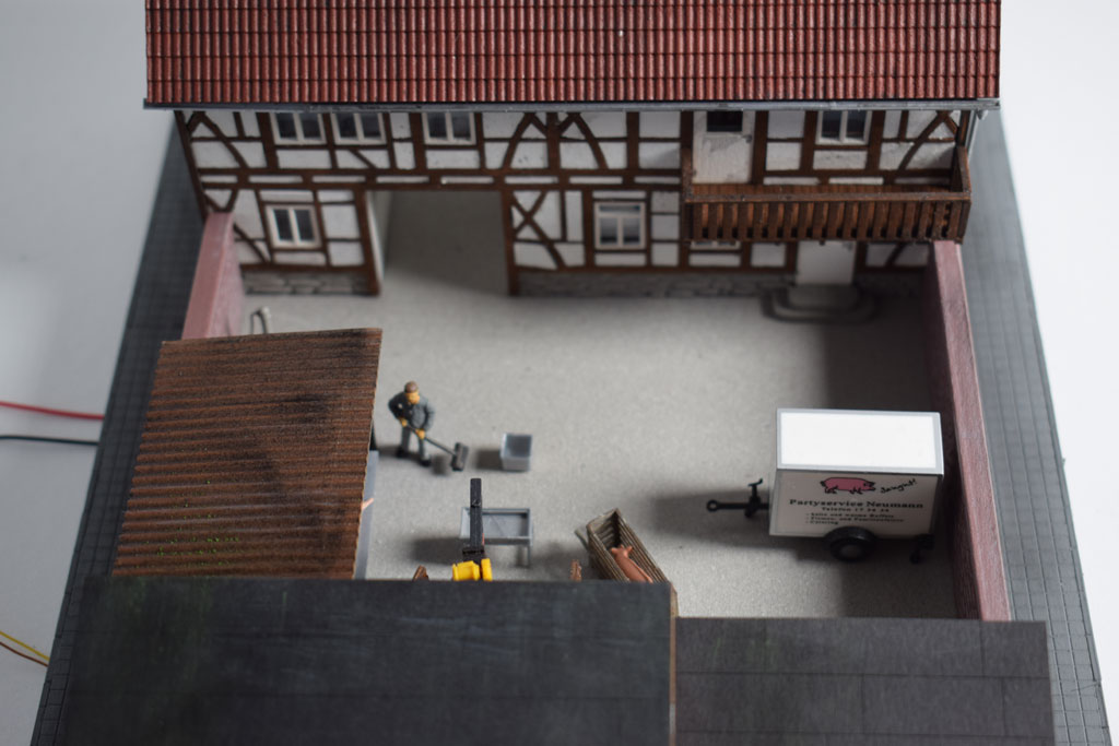 Die Metzgerei habe ich nach Bauanleitung zusammengebaut. Der Verkaufsraum wurde weiß gestrichen und mit Verkaufstresen, Metzgerutensilien und Figuren ausgestattet. Die Einfahrt zum Hinterhof sowie der Verkaufsraum erhielten eine Beleuchtung. Der Hinterhof wurde mit typischen Schlachterei Utensilien ausgestattet. Auch für den Partyservice steht ein Hänger für die Lieferung bereit.
