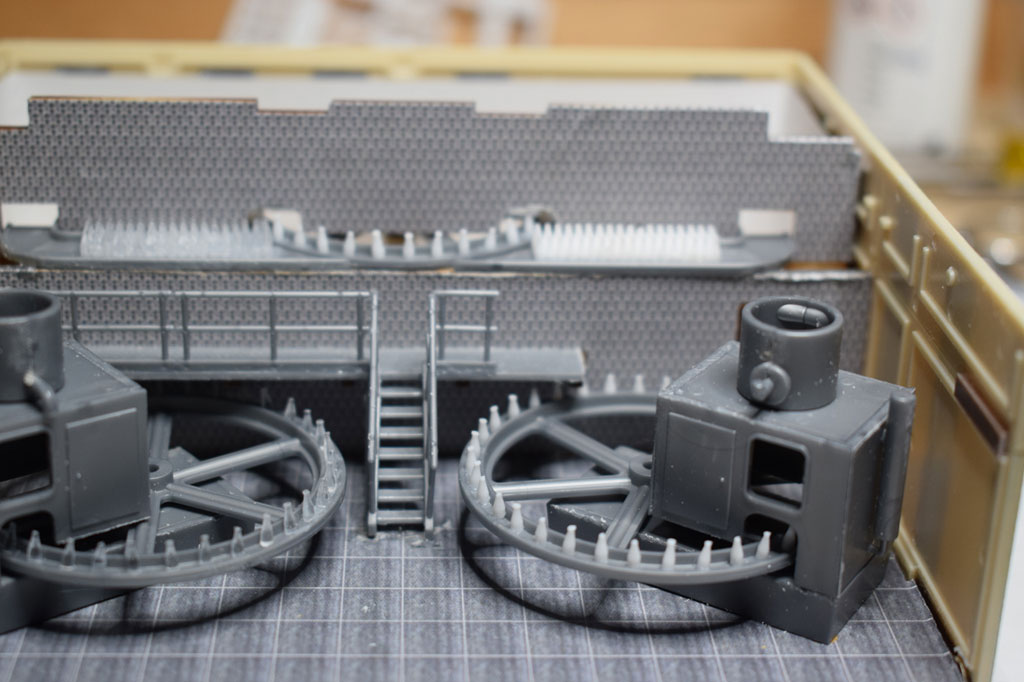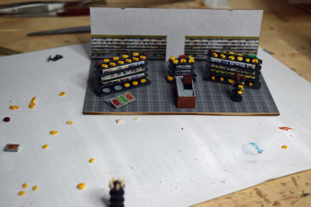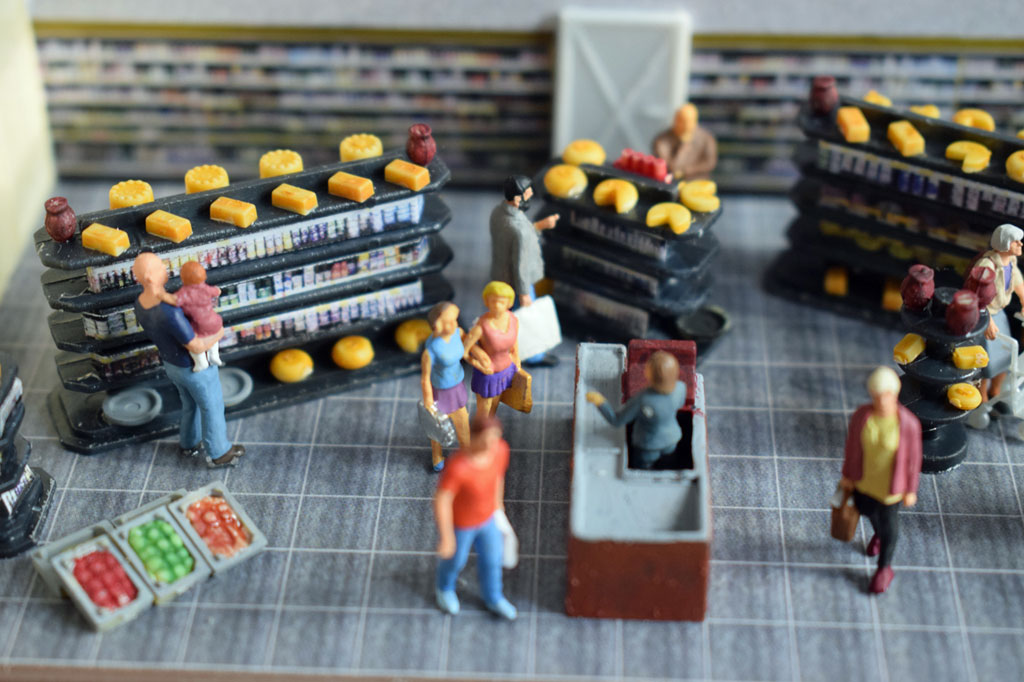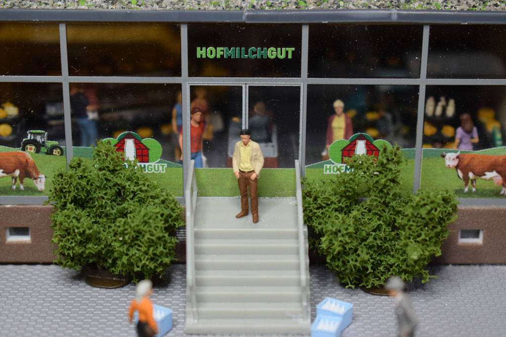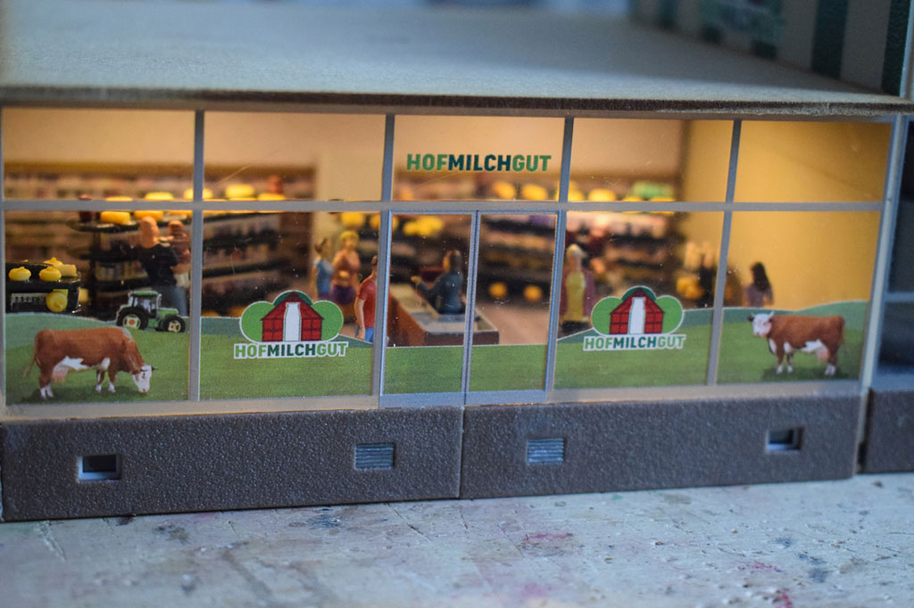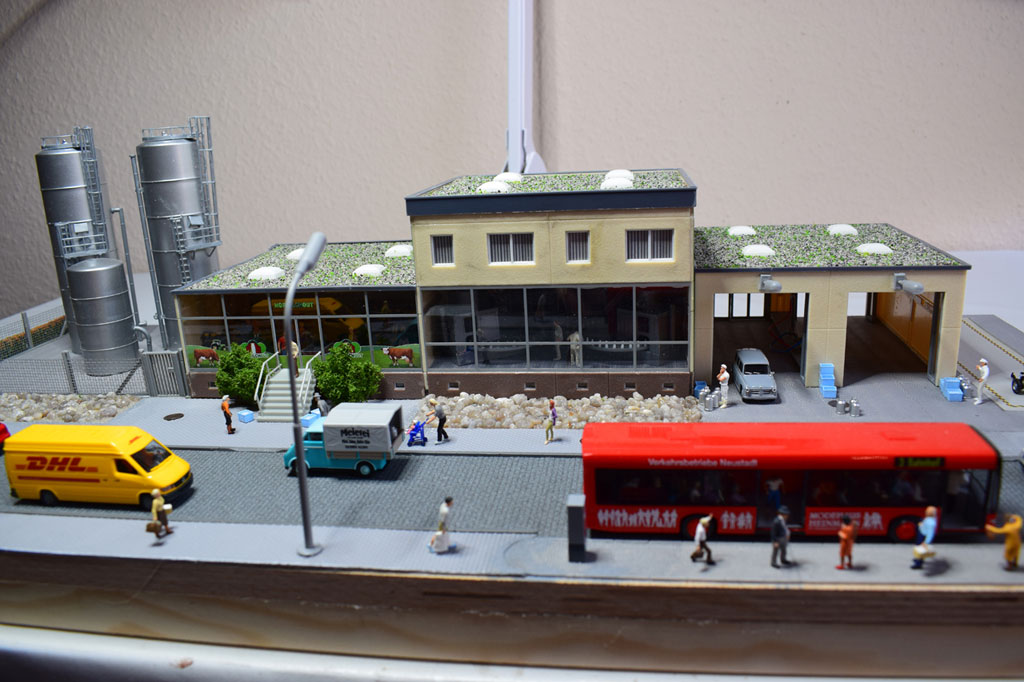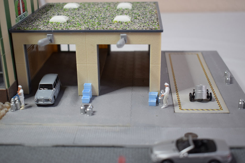 Auf einer Fläche von 80×32 cm wurde eine Molkerei von Faller (130198) als Diorama umgesetzt. Der Bausatz enthält alles um eine Frischmilchmolkerei mit Vorführbetrieb dar zu stellen. In den zwei Stapeltanks aus Edelstahl wird die Milch für die Weiterverarbeitung zwischengelagert. Dazu gibt es einen Anbau mit Außenwaage (Faller 130197) für die Anlieferung der Frischmilch. An der vorderen Glasfront kann der Besucher die Flaschenabfüllung und das Etikettieren der Flaschen beobachten. Die Abfüllanlage wird mit einem Motor von Faller angetrieben. In der Verkaufshalle können dann die Produkte aus der Molkerei erworben werden. Vor der Molkerei wurde eine Straße mit beidseitigem Fußweg erstellt.