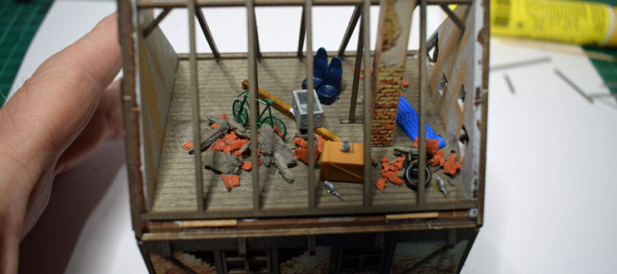 Im Bausatz befindet sich auch ein Beutel mit Schutt zur weiteren Gestaltung. Mit Pflanzen und Bäumen wurde das Diorama weit ausgestattet. Eine intensive Verwuchern sollte dargestellt werden.