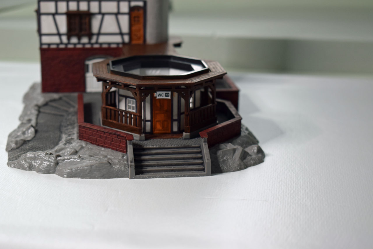 Ein sehr schönes und aufwendig gestaltetes Modell, welches ideal auf einer Anhöhe eingesetzt werden kann. Die Terrasse und der Turmboden sind aus Holz gefertigt und entsprechend lasiert. Kleinteile zur Ausgestaltung liegen bei. Durch den Vorbau der Terrasse passte das Modell sehr gut in die Weinberg-Landschaft.