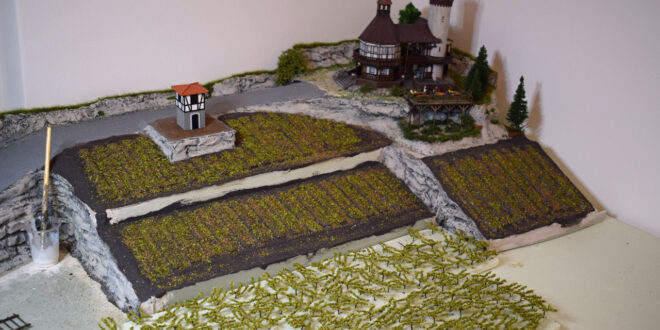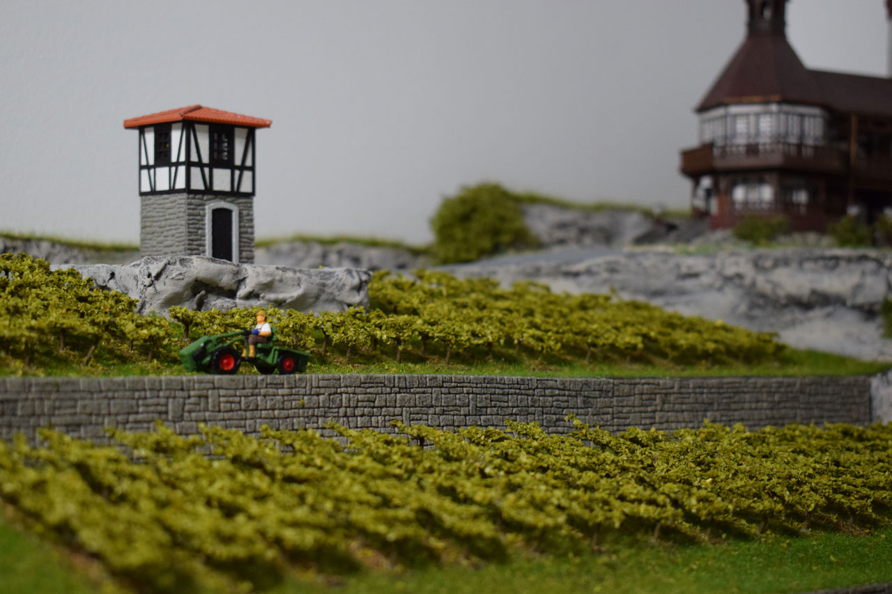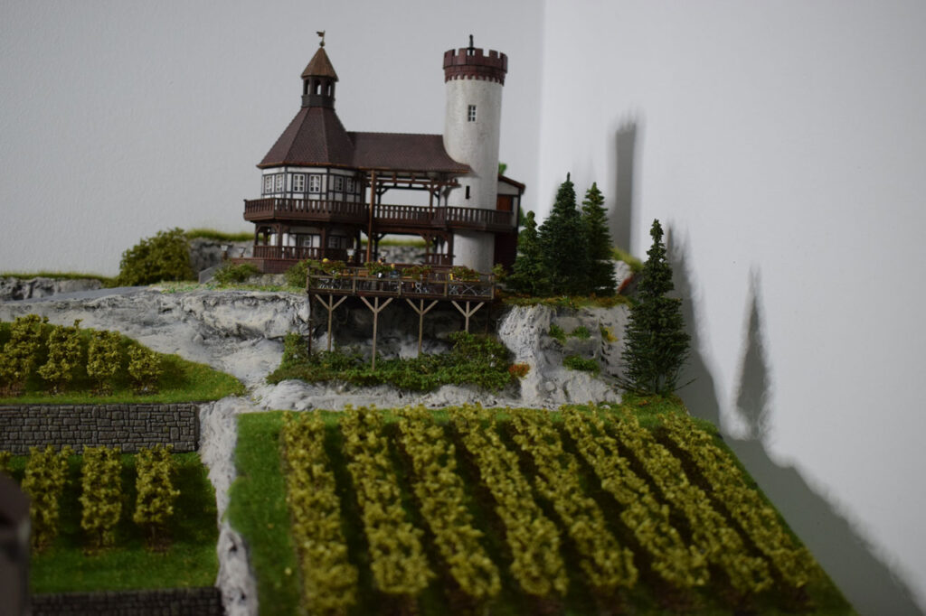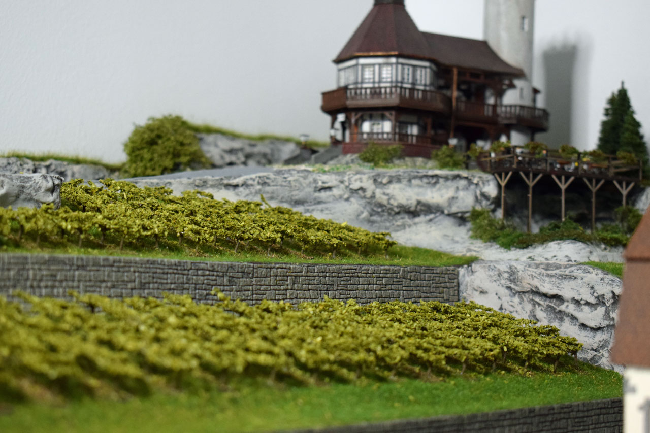 Die Kombination eines Weinbergs mit einer Burg ist ein beliebtes Thema im Modellbau und wird häufig in Dioramen oder Modellbahnanlagen dargestellt, da es eine reizvolle, typisch mitteleuropäische Landschaftsszene schafft.