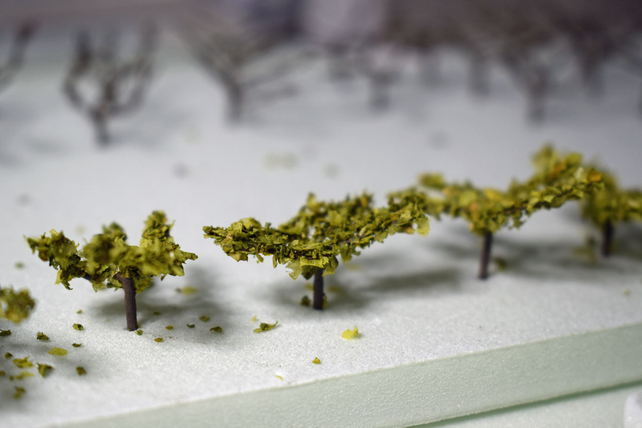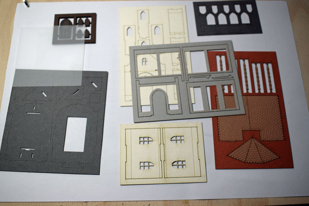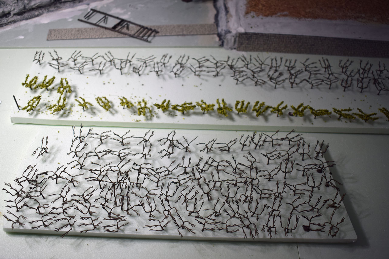 2021 habe ich mal angefangen einen Weinberg mit Weingut und Burgschloss zu bauen. Für das Weingut habe ich ein Modell von Noch (66712 H0) gewählt. Dazu das Gesindehaus, Brunnen und eine Weinpresse. Alles ist mit Laser geschnitten. Fensterrahmen und Kanten sind bereits ausgeschnitten. Beim Zusammenbau auf jeden Fall auf die richtige Reihenfolge laut Anleitung achten. Leider konnte ich das Diorama wegen Umzug in eine kleinere Wohnung nicht fertigstellen.